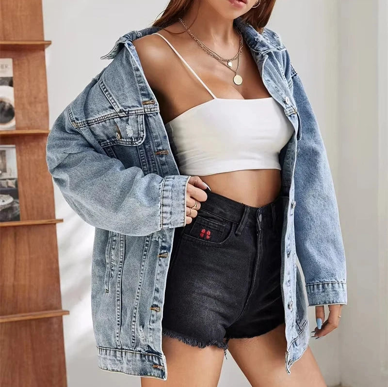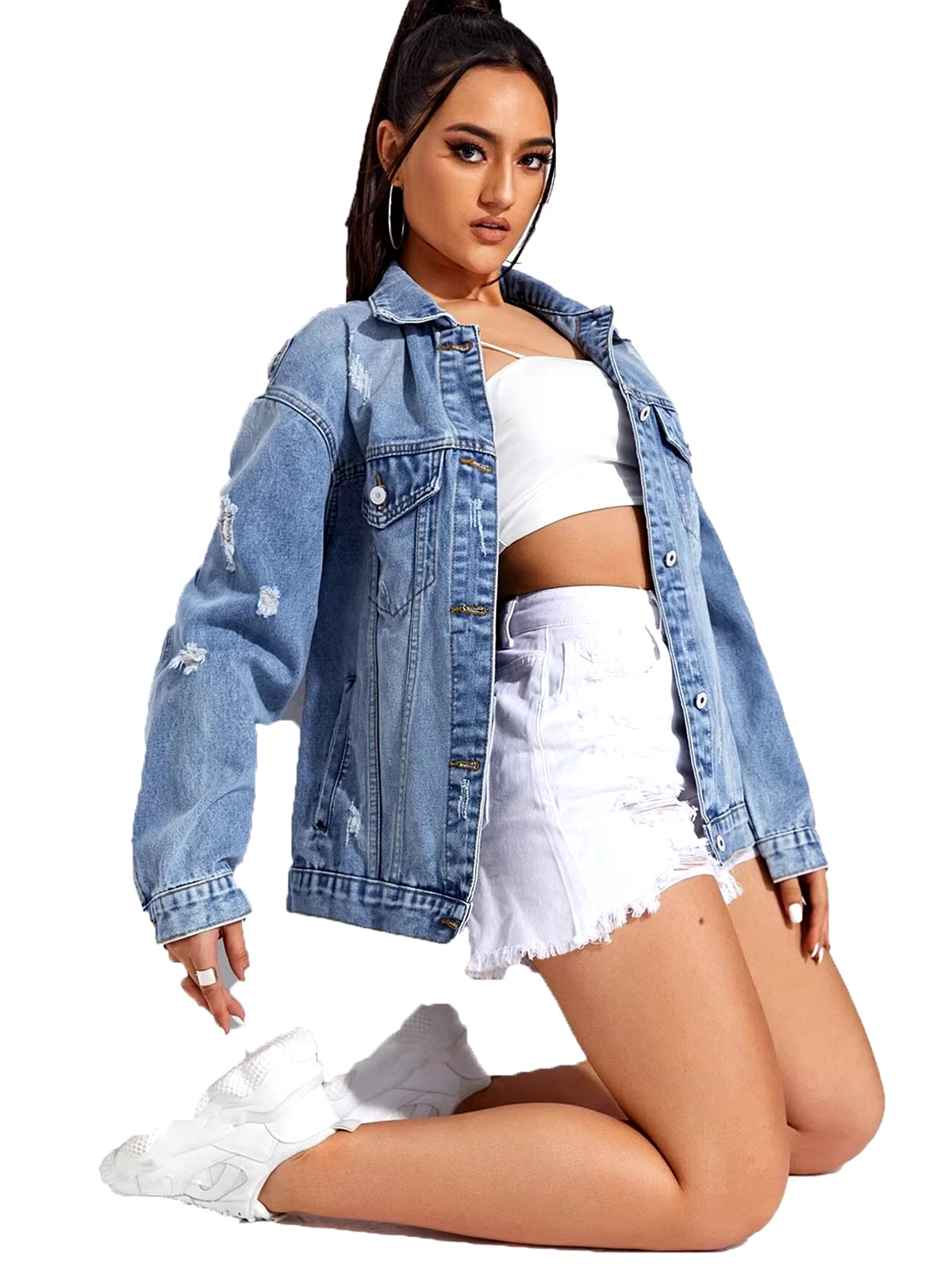 Opta por un look audaz y a la moda con esta chaqueta de mujer en jean rasgada, perfecta para quienes aman mezclar vintage y moderno. Diseñada con detalles rasgados sutiles, esta chaqueta aporta un toque de carácter y rebeldía a tus conjuntos, manteniéndose elegante y chic. Su corte midi te permite llevarla tanto con shorts en verano como con jeans o vestidos en los meses más frescos, para un estilo versátil que no pasa desapercibido.