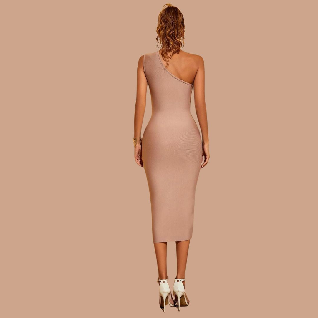 - Diseño: asimétrico, un hombro descubierto, con abertura