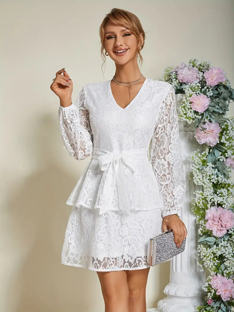 Vestido de mujer - Encaje floral elegante - Mangas largas transparentes - Escote en V ajustado. Vestido elegante de encaje floral con mangas largas transparentes y un favorecedor escote en V. Perfecto para un look femenino y sofisticado, ideal para diversas ocasiones.