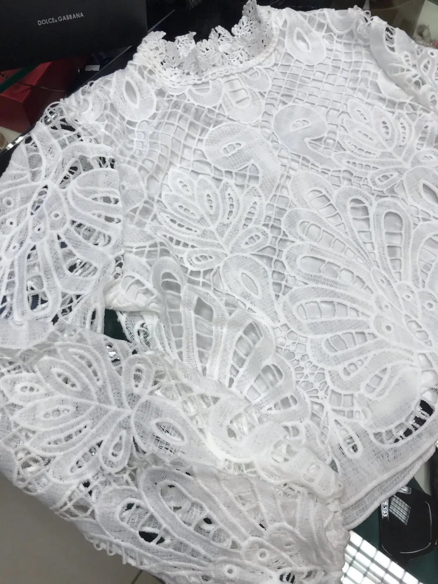 - Design: Pizzo floreale, maniche lunghe a sbuffo, taglio corto