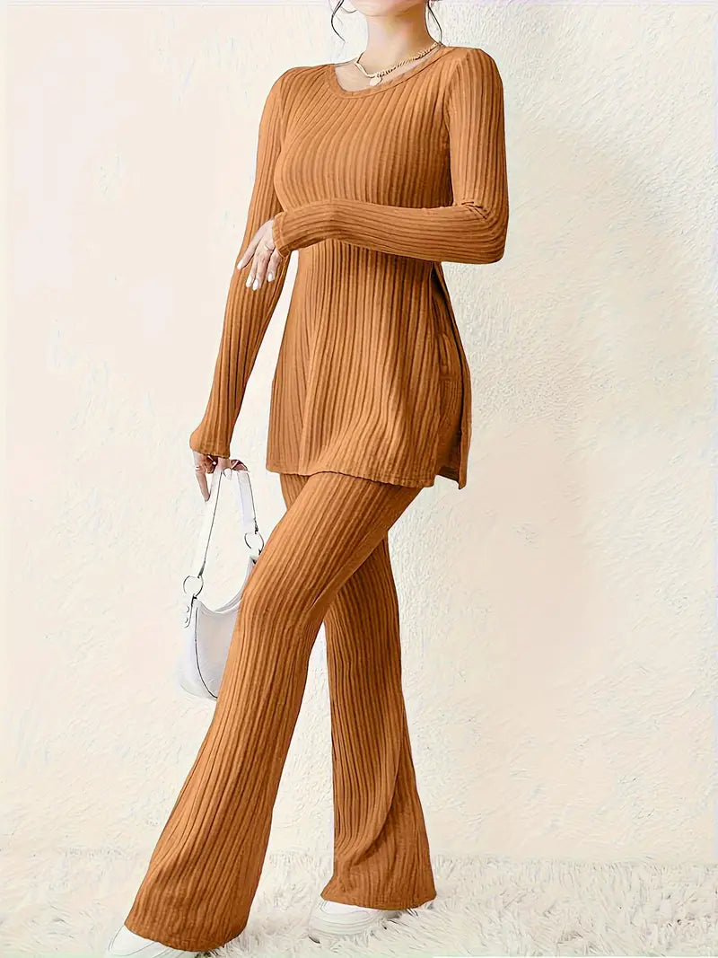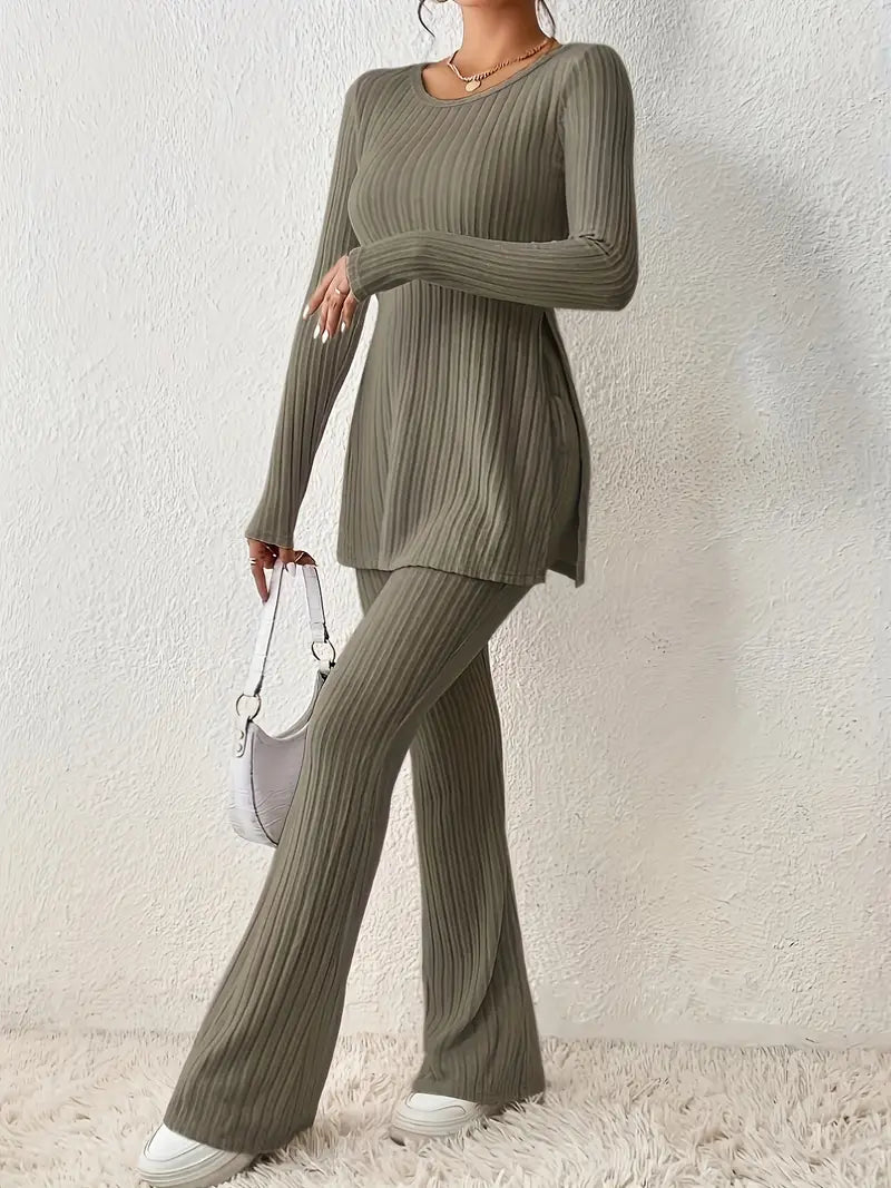Completo Donna in Maglia a Coste - Top Maniche Lunghe - Pantaloni Svasati Ozarvo. Scopri questo completo due pezzi in maglia a coste, composto da un top a maniche lunghe e pantaloni svasati. Confortevole ed elegante, è ideale per un look casual e alla moda.