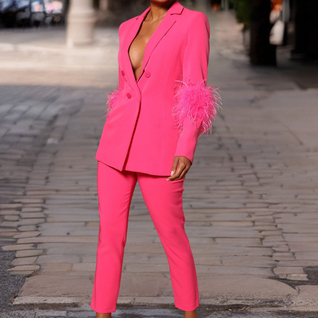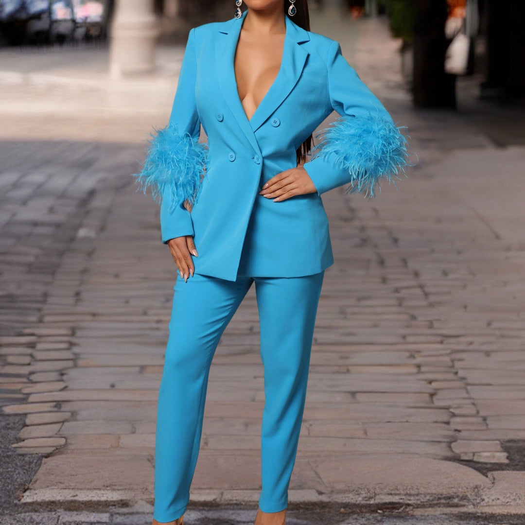 Attira l'attenzione a qualsiasi festa con il nostro elegante completo 2 pezzi "Frida" da donna, che comprende un blazer audace con scollo a V profondo e pantaloni slim eleganti. Progettato per la donna sicura di sé e all'avanguardia, questo completo promette di fare una dichiarazione audace ovunque tu vada.