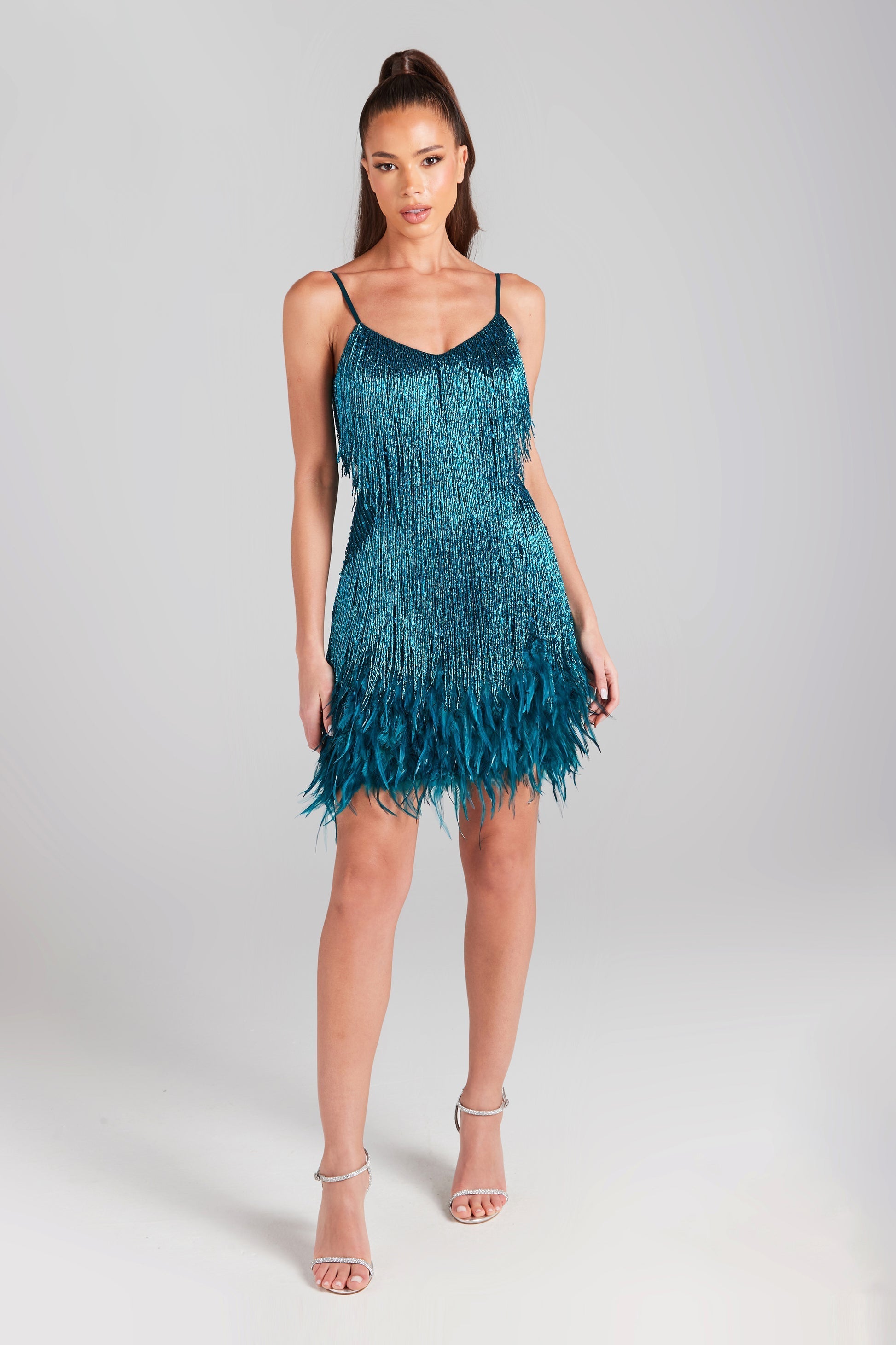 Lasciati sedurre da Sophie – Abito Splendente e Confortevole con Paillettes e Dettagli in Piuma, un pezzo d'eccezione pensato per chi desidera brillare nelle serate più indimenticabili.