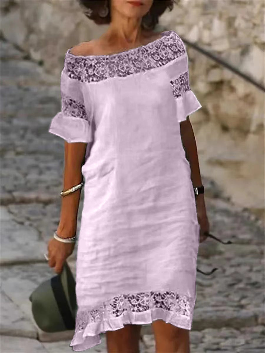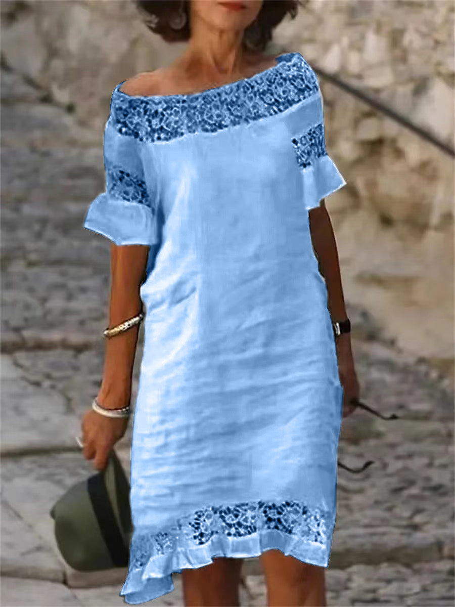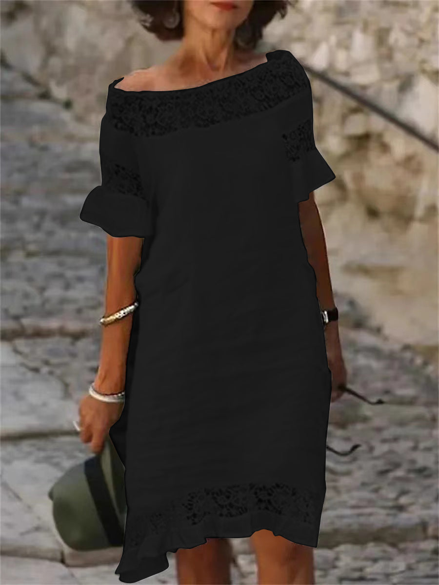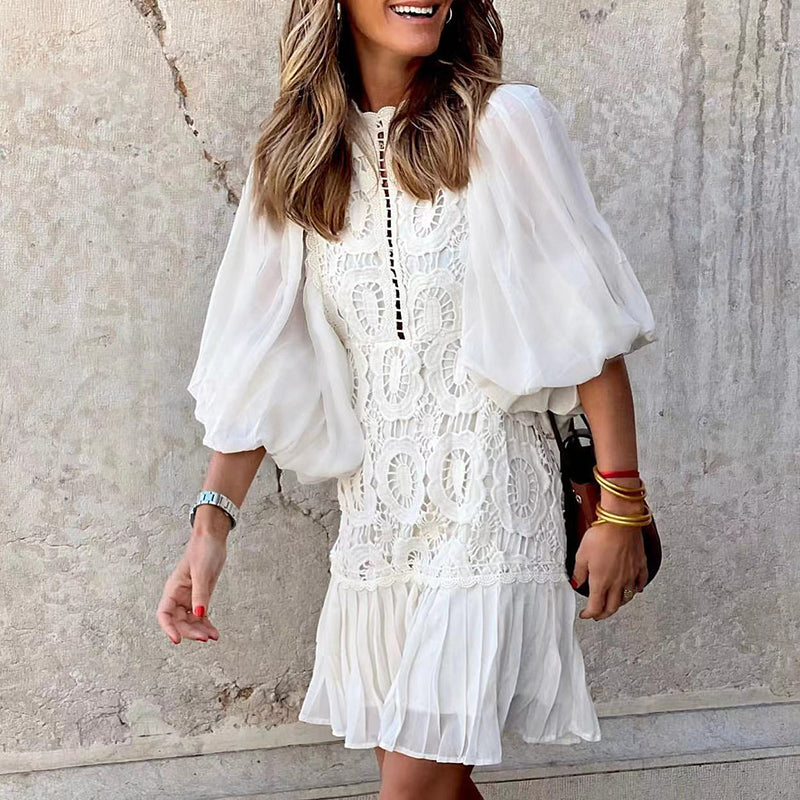 I suoi delicati dettagli in pizzo catturano lo sguardo con finezza, mentre il taglio midi valorizza ogni movimento con grazia. Perfetto per un garden party, un brunch in terrazza o una passeggiata in città, ti accompagna con stile per tutta la stagione.